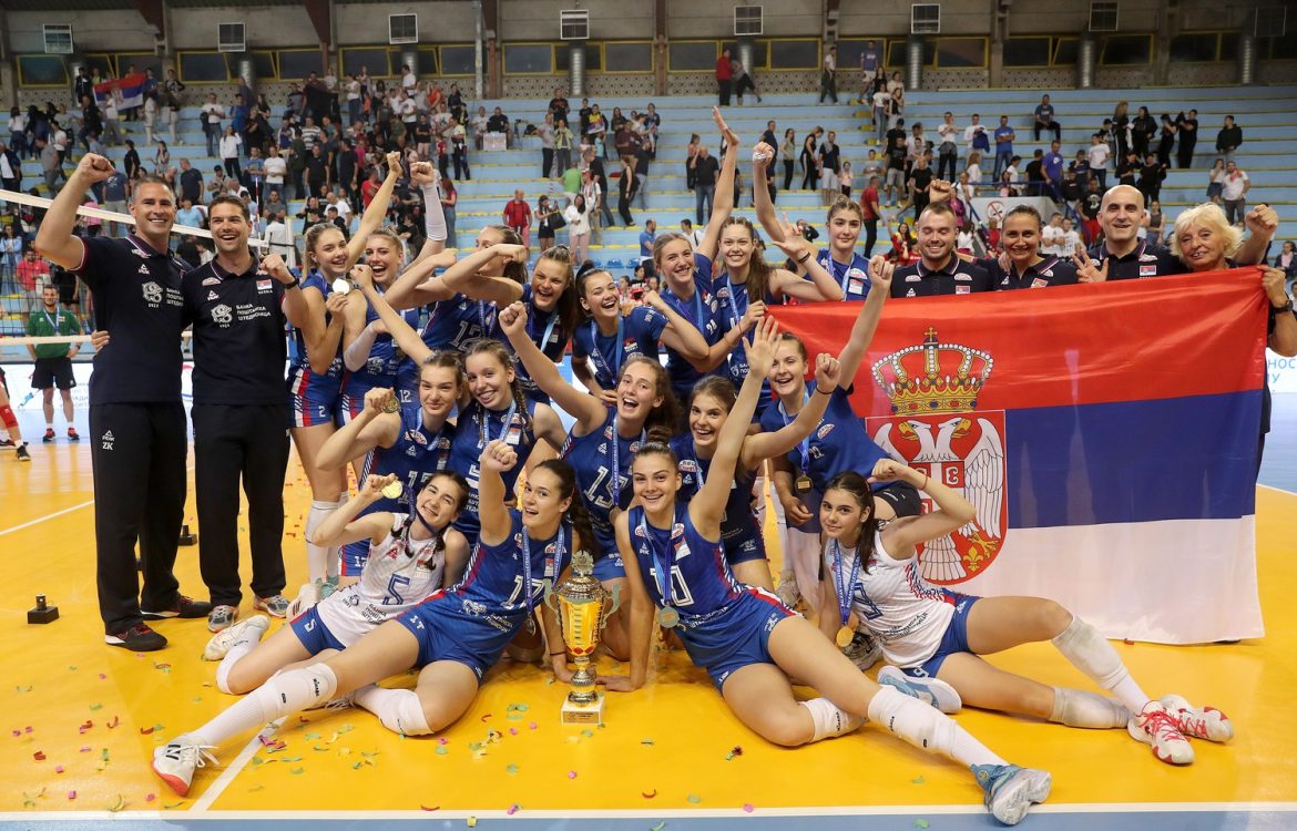 President of Volleyball Federation Serbia Zoran Gajic handed over championship trophy to Teodora Krickovic, team captain of Serbia.